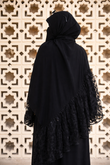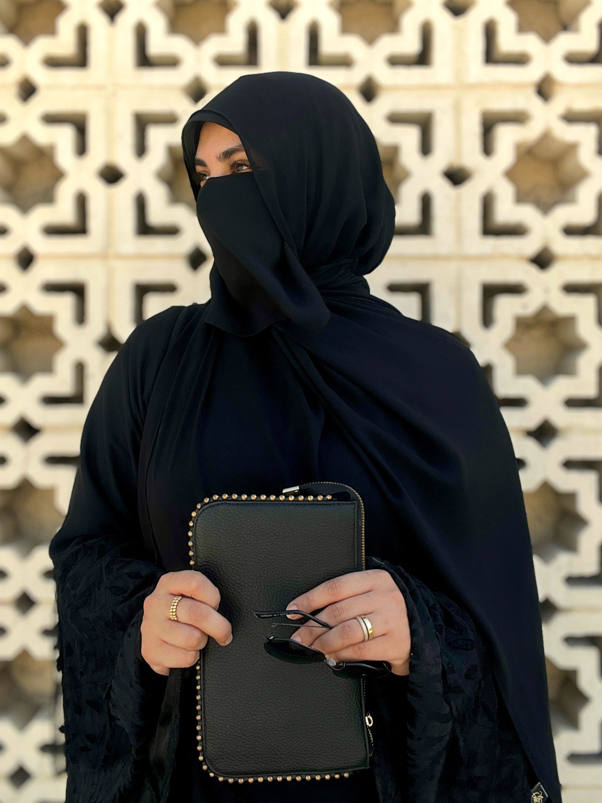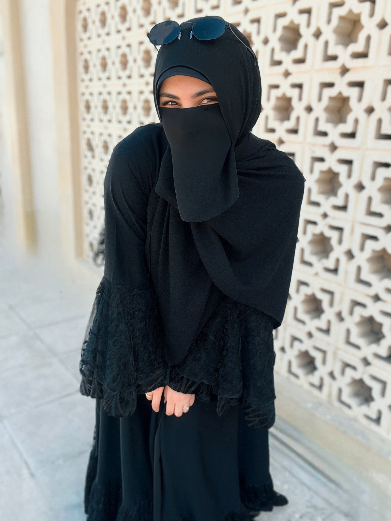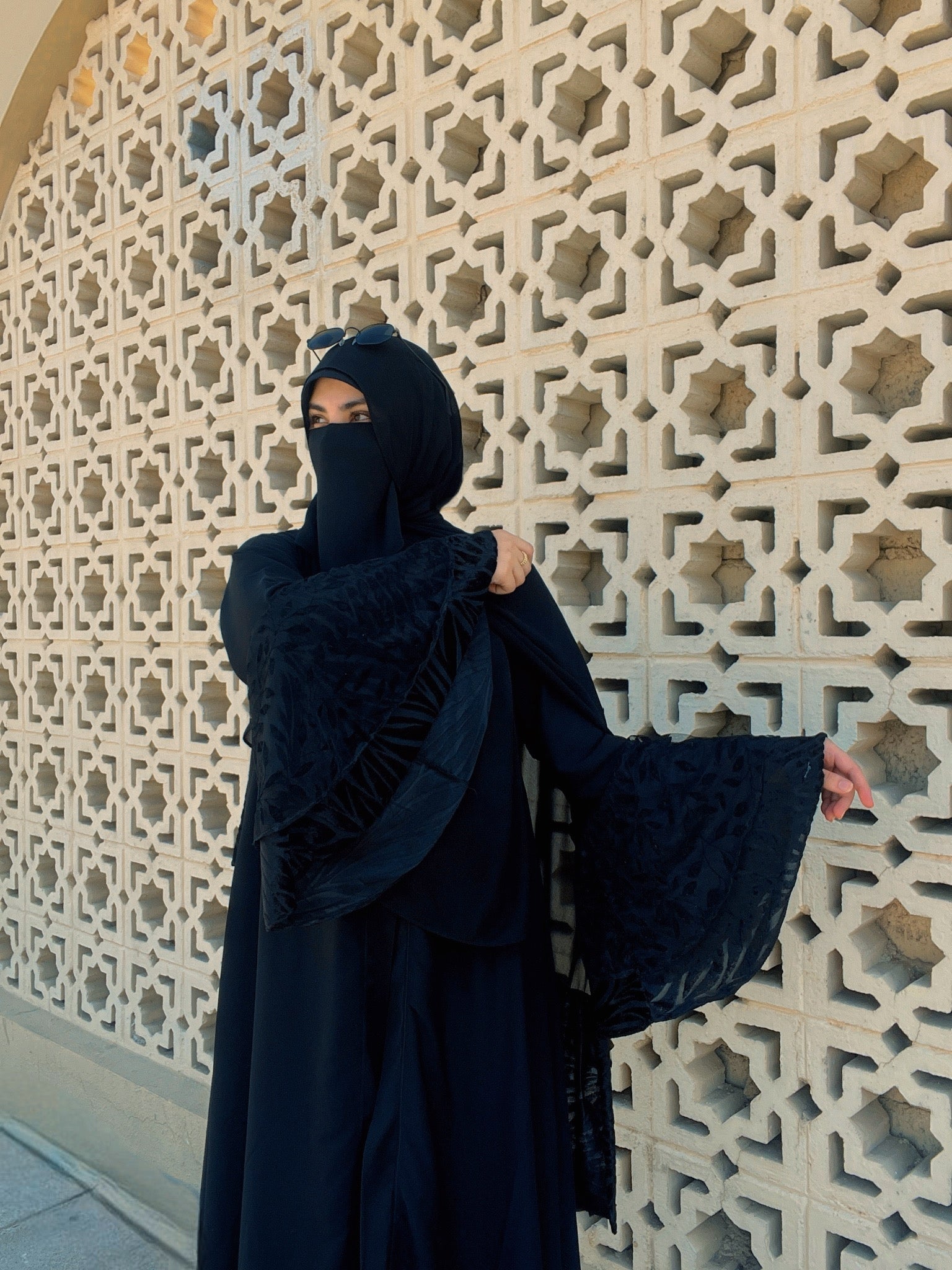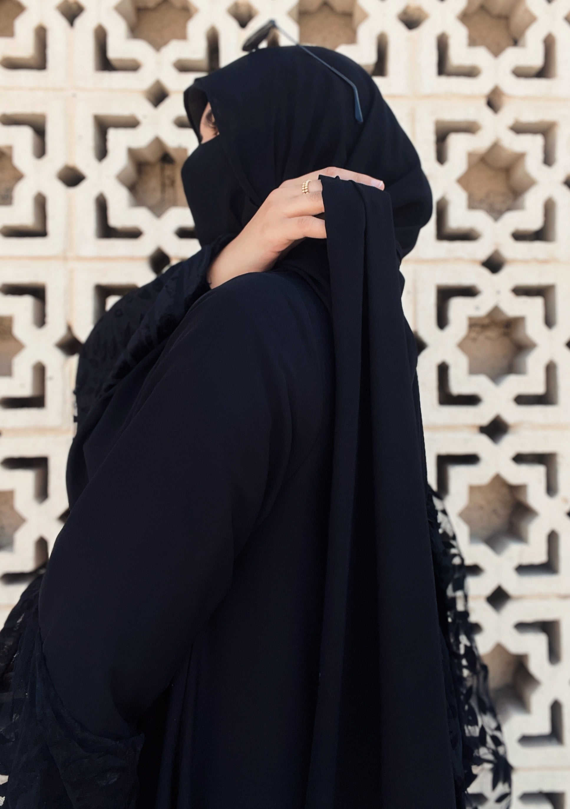 A luxurious Saudi silk abaya with an elegant flow, perfect for Ramadan evenings and special occasions.